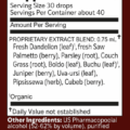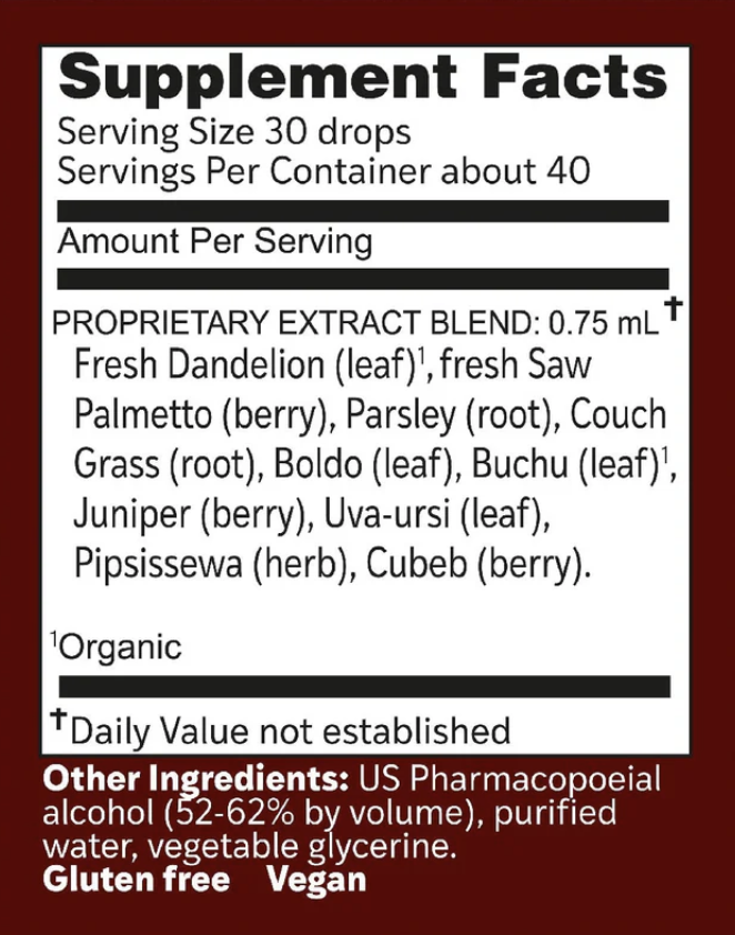 Organic Fresh Dandelion (leaf), Fresh Saw Palmetto (berry), Parsley (root), Couch Grass (root), Boldo (leaf), Organic Buchu (leaf), Juniper (berry), Uva-ursi (leaf), Pipsissewa (herb), Cubeb (berry).