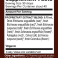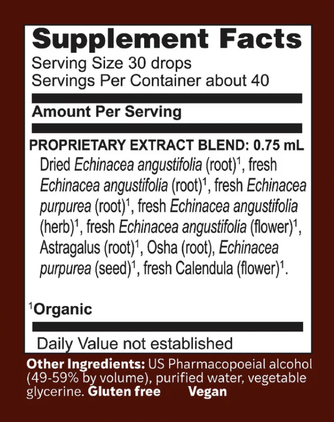Organic fresh Echinacea angustifollia root, Organic Echinacea angustifolia herb and flower, Organic dried Echinacea angustifolia root, Organic fresh Echinacea purpurea root, Organic Astragalus root, Osha root, Organic Echinacea purpurea seed, Organic fresh Calendula, US Pharmacopoeial alcohol (49-59% by volume), purified water, vegetable glycerine