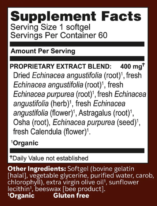 Other Ingredients: Softgel (bovine gelatin [halal], vegetable glycerine, purified water, carob, chlorophyll), Organic extra virgin olive oil, Organic sunflower lecithin, beeswax [bee product]