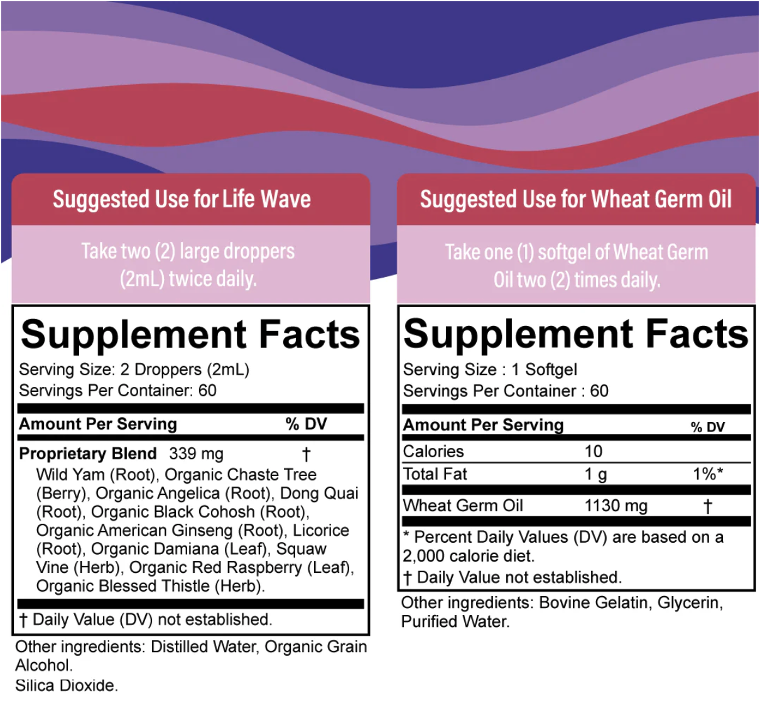 Life Wave is designed to support women in their reproductive years by promoting healthy hormonal balance and regular menstrual cycles.* Designed to support fertility, healthy regular periods, and a balanced mood. This 2-part kit system includes a liquid herbal tincture, paired with Wheat Germ Oil softgels, for comprehensive nutritional support. Together, they help foster emotional and physical balance throughout the month. With additional benefits like nourishing skin, a happy gut, and overall cycle comfort, Life Wave helps you handle every month with confidence and ease.*