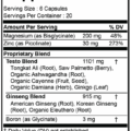 Magnesium (as Bisglycinate), Zinc (as Picolinate), Tongkat Ali (Herb), Saw Palmetto (Berry), Organic Ashwagandha (Root), Organic Cayenne (Fruit, Seed), Organic Damiana (Herb), Ginkgo (Leaf), American Ginseng (Root), Korean Ginseng (Root), Organic Eleuthero (Root), Boron (as Glycinate).