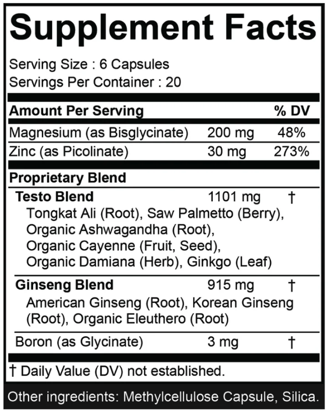 Magnesium (as Bisglycinate), Zinc (as Picolinate), Tongkat Ali (Herb), Saw Palmetto (Berry), Organic Ashwagandha (Root), Organic Cayenne (Fruit, Seed), Organic Damiana (Herb), Ginkgo (Leaf), American Ginseng (Root), Korean Ginseng (Root), Organic Eleuthero (Root), Boron (as Glycinate).